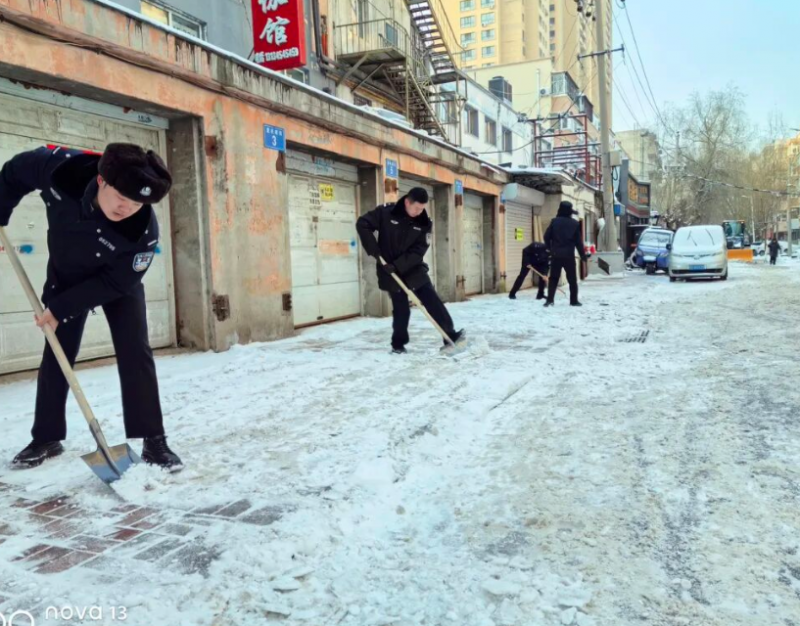 前进分局组织党员先锋队下沉社区,开展清雪志愿服务活动。全体民警辅警分工协作,清理社区出入口、主干道等区域,保障居民出行安全,拉近了警民距离。