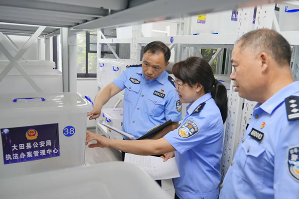 大田县公安局执法办案管理中心民警在物品保管室清点涉案物件