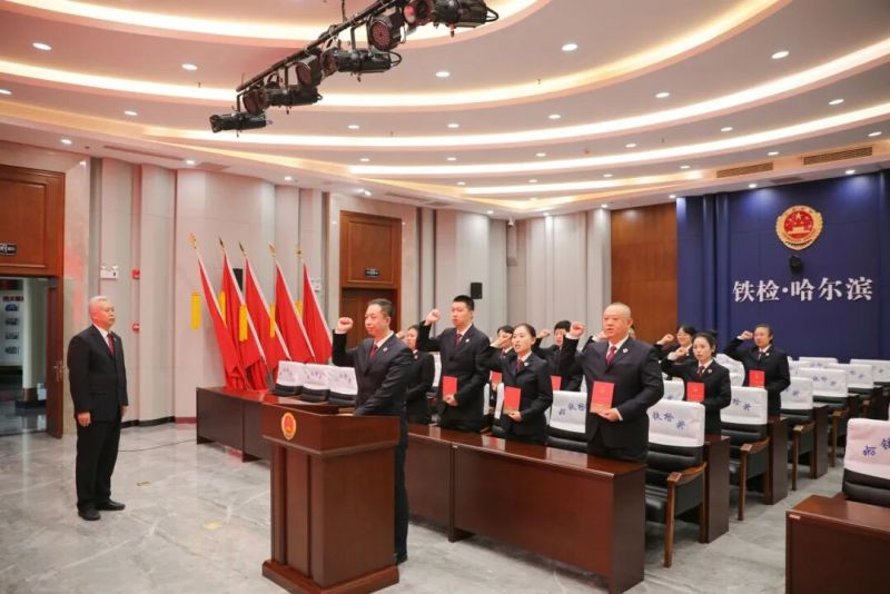 在国家宪法日这个特殊时刻,哈尔滨铁路运输检察院组织全体检察人员举行庄严的宪法宣誓仪式。仪式现场,国徽高悬,国旗庄严,干警们身着检察制服,整齐肃立,面向国旗举起右拳,以铿锵誓言表达对宪法的忠诚信仰与对检察事业的无限热爱。
