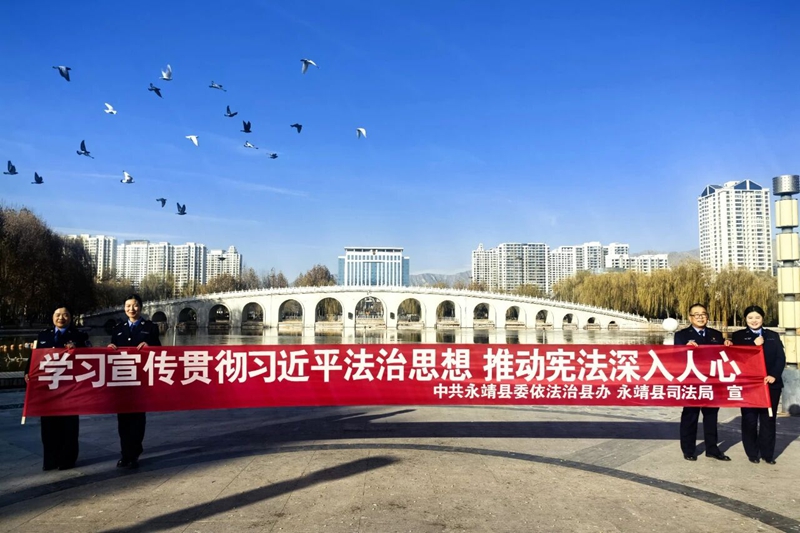 在临夏州永靖县古城新区彩陶广场内,宪法主题公园和主题街道让法治元素与自然、人文景观巧妙交织,在赋予公园深厚法治文化底蕴的同时,将宪法知识、法言法语等法治元素“住”进了优美风景,使群众在休闲娱乐的过程中领略法治文化、感受宪法精神。在这里,永靖县司法局开展了一场以“学习宣传贯彻习近平法治思想 推动宪法深入人心”为主题的宪法宣传活动,将法治的种子播撒到了群众的心中。