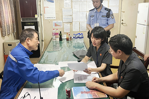 厦门海事法院干警与外籍船长沟通,耐心解释我国法律的相关规定及所需保全的各项证据内容
