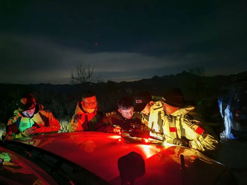 17时30分,救援力量火速集结:大峡谷派出所民警、太行创安协会、山蓝救援队、雷霆救援队,再加上熟谙地形的当地向导,一支分工明确、战力拉满的联合救援队整装出发。民警坐镇统筹,一边紧盯后方联络、协调各方,一边持续通过电话安抚被困者情绪,用声音驱散他们的恐惧;向导打头阵探路,精准避开陡峭崖壁与暗藏的陷阱;专业救援队员则扛着无人机、强光手电、救援绳索等装备,随时准备开展技术搜索与攀爬救援。