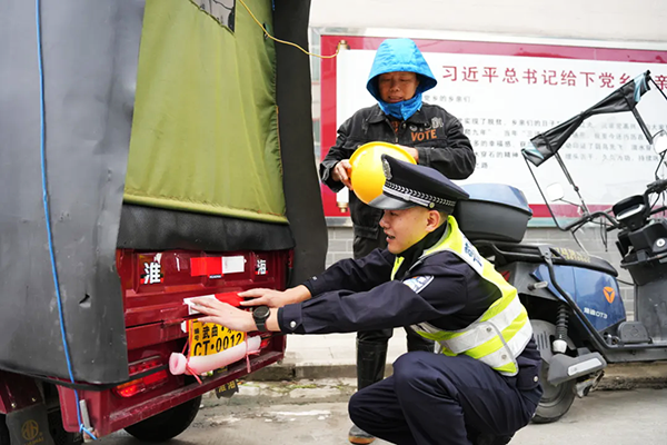 民警为电动自行车、二三轮摩托车粘贴反光条,让车辆在夜色中多了一层醒目警示