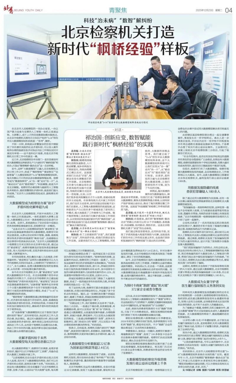 如今,这种“大数据模型”已融入北京检察机关的日常工作之中,形成了“枫控智检”“索迹智见”“法脉智鉴”三大模型领衔的“3+N”数智检察模型矩阵,每天有数以万计的涉法涉诉数据被智能处理。检察官成为“数据指挥官”,从“办一案”走向“治一片”,从“被动应对”走向“提前预防”。“科技赋能,就是为平安北京赋能。检察官的办案思维与最新的人工智能技术相结合,提前预警预防矛盾纠纷,就是我们最大的成效。”北京市人民检察院党组成员、副检察长祁治国说。