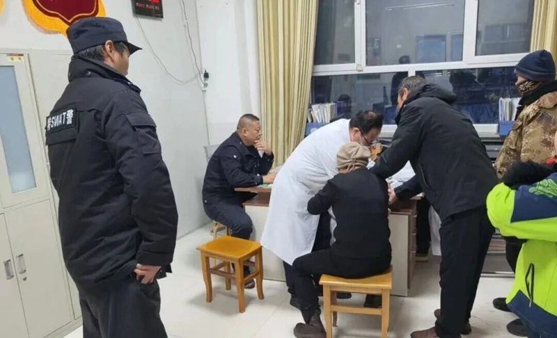特警队员看到后,立即停车上前,发现其中一名女子面色苍白,正用纸巾捂住口鼻,鲜血已渗透纸巾,并不断滴落。她声音微弱,表示自己鼻腔出血难以止住,且头部剧痛、浑身颤抖。她的丈夫在一旁手足无措,焦急万分。雪越下越大,气温极低,等待普通车辆救援可能延误时机。