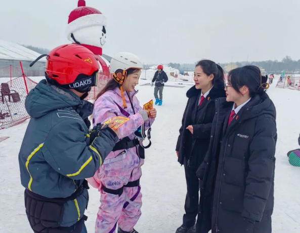 道外区人民法院前往辖区滑雪场为游客们送上法律小贴士和“暖宝宝”,在冰天雪地中提供暖心服务、传递司法温度,护航辖区冰雪经济健康发展。