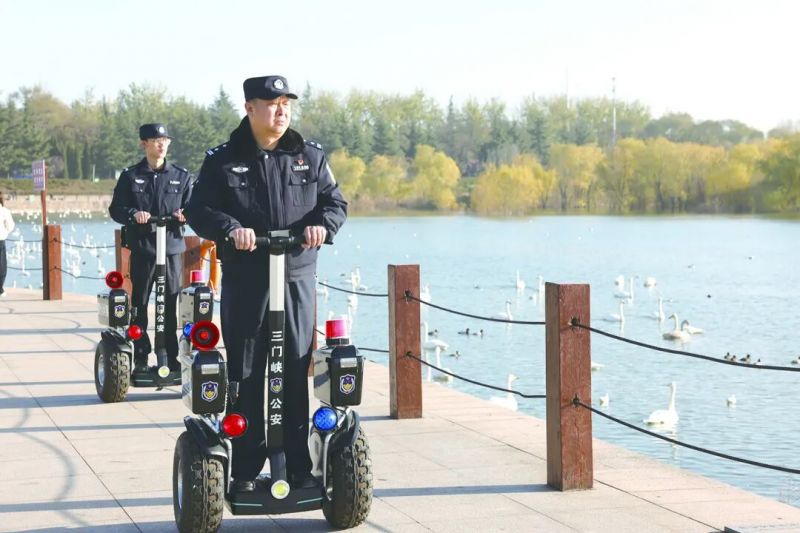 三门峡市公安局环食药侦支队民警在天鹅湖巡逻