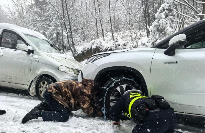 “您可千万不要迷信‘四驱’,这么大的雪凌,把防滑链装上才安全!”当天上午8时许,笔者随警采访时看到,张金星正跪在雪地里为一辆外地游客的轿车安装防滑链。由于轿车底盘较低,他一手撑地、身体匍匐,另一只手探进前轮内侧摸索固定链条,再起身用液压钳修剪多余链节。10多分钟里,寒风裹挟雪花不断砸在他的警帽和警服上,裸露的双手糊满雪水与泥泞,冻得通红发紫,他却全然不顾。“好了,慢点开!”安装完毕后,他笑着向连声道谢的驾驶员再次叮嘱。