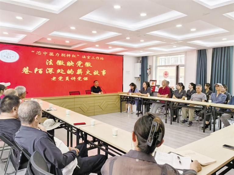 “法徽映党徽·巷陌深处的薪火故事”主题党日上,老支书“端平一碗水”的故事让人动容;“老吴”的审判智慧让人受益;青年法官党员的法治信仰让人振奋。“银青结对”传经验,“庭进社区”练本领,组织生活从“会场”搬到“现场”,党性在一线锤炼,本领在一线提升,服务在一线落地。