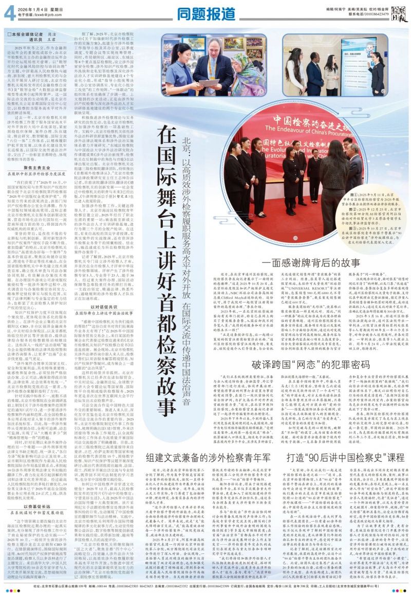 如何让中国检察声音穿透文化壁垒?2025年12月,最高人民检察院发布的宣传片《行动中的检察官:守望美好生活》,入选2025年中国法治国际传播十大典型案例。该片采用纪实手法跟拍检察官处理涉外商事纠纷的日常,生动展现了中国检察官的履职细节与法治精神。实践中,北京市检察机关利用符合国际传播规律的多元化叙事方式,生动宣传检察公益诉讼、数字检察等制度创新成果和实践经验,获得新加坡、越南等多国检察人员的高度评价。 “北京市检察机关将继续胸怀‘国之大者’,聚焦首都‘四个中心’战略定位,自觉融入涉外法治大协同格局,以高质效涉外检察履职服务高水平对外开放,为推进中国式现代化的北京篇章提供更加有力的法治保障。”北京市检察院党组副书记、分管日常工作的副检察长张朝霞说。