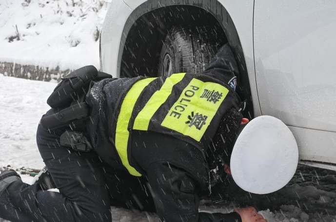 “您可千万不要迷信‘四驱’,这么大的雪凌,把防滑链装上才安全!”当天上午8时许,笔者随警采访时看到,张金星正跪在雪地里为一辆外地游客的轿车安装防滑链。由于轿车底盘较低,他一手撑地、身体匍匐,另一只手探进前轮内侧摸索固定链条,再起身用液压钳修剪多余链节。10多分钟里,寒风裹挟雪花不断砸在他的警帽和警服上,裸露的双手糊满雪水与泥泞,冻得通红发紫,他却全然不顾。“好了,慢点开!”安装完毕后,他笑着向连声道谢的驾驶员再次叮嘱。