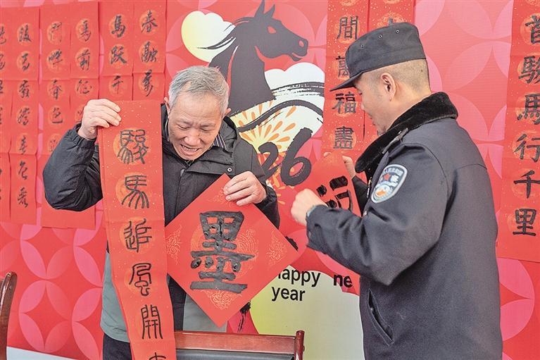 “铁警送福”区域,墨香四溢。民警们在红纸上挥毫泼墨,“平安旅途”“新春大吉”的字样跃然纸上。一副春联刚落笔,就被旅客李霖迫不及待地接了过去。正要动身前往陕西省西安市的他开心地说道:“我们老两口把福字带到西安去!”