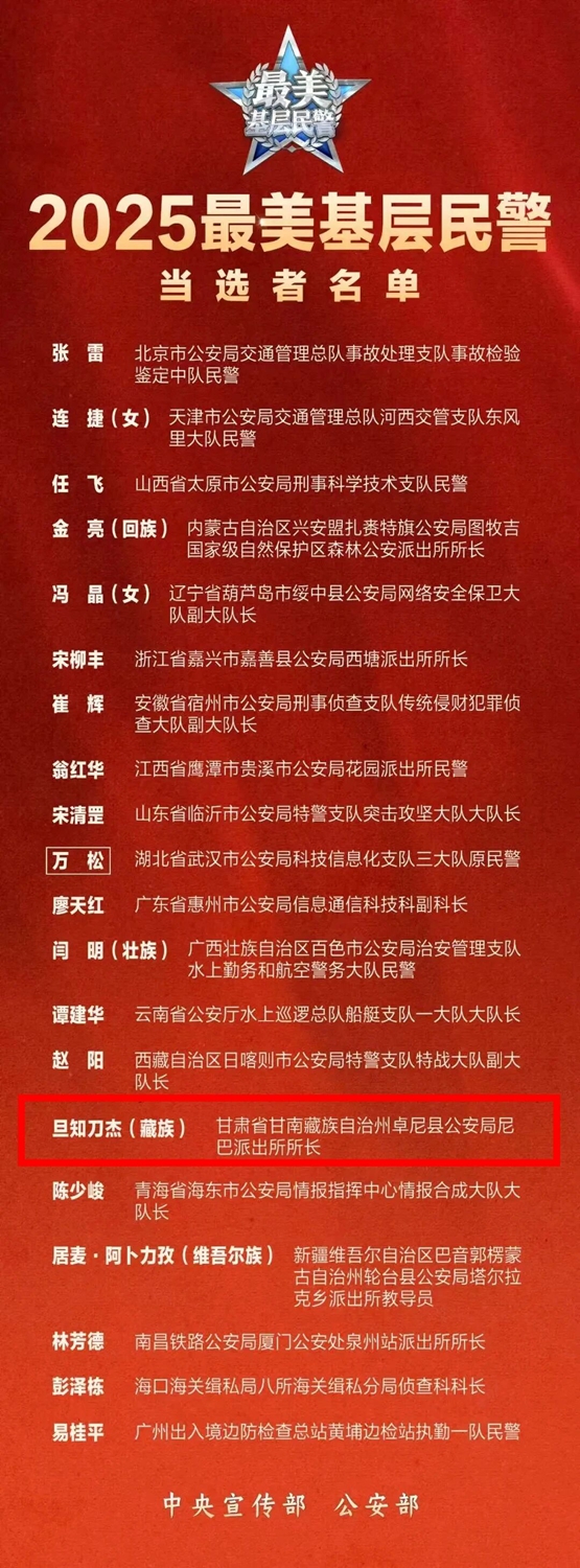 为深入学习贯彻习近平总书记关于新时代公安工作的重要论述,进一步凝聚建设平安中国、法治中国的力量,在第六个中国人民警察节之际,中央宣传部、公安部向全社会发布“最美基层民警”。其中,甘肃省甘南州卓尼县公安局尼巴派出所所长旦知刀杰光荣入选。