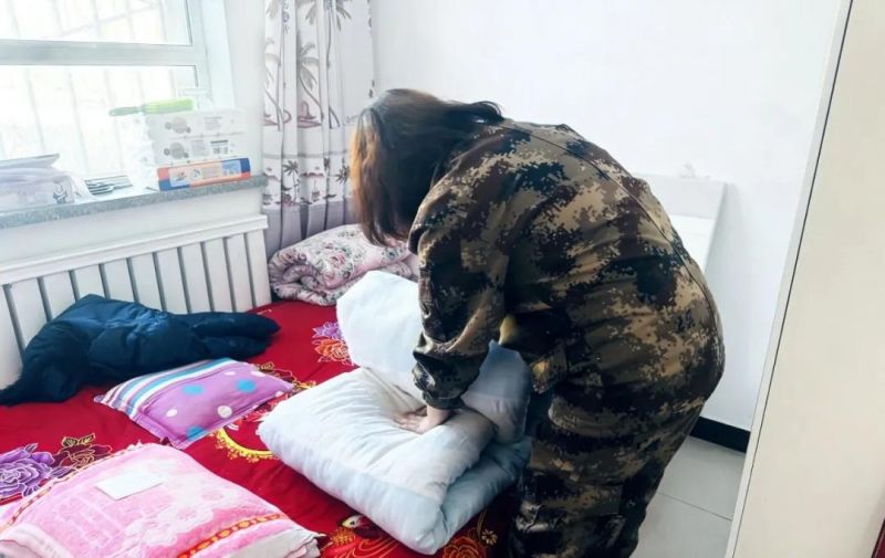 闲聊片刻,几人拿起抹布便忙了起来,利落地擦拭家具、门窗,清扫整理房间。看着床上散乱的被褥,几人又麻利地将被子叠得方方正正,棱角分明如军营里的标准模样。