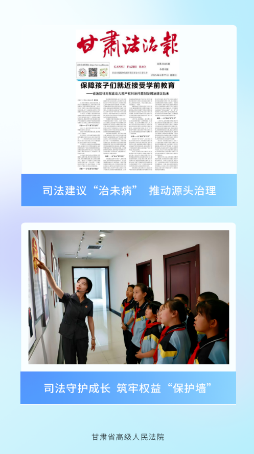 守护未来,甘肃法院将未成年人权益保护置于首位,持续深化家事审判改革。深化“三审合一”综合审判,对侵害未成年人犯罪“零容忍”,坚持对涉罪未成年人“教育、感化、挽救”。依法发出人身安全保护令与关爱未成年人提示函,筑牢家庭保护防线。同时,通过选任法治副校长、开展“法院开放日”、“开学法治第一讲”等活动,促进“六大保护”协同发力,织密未成年人健康成长的安全网。