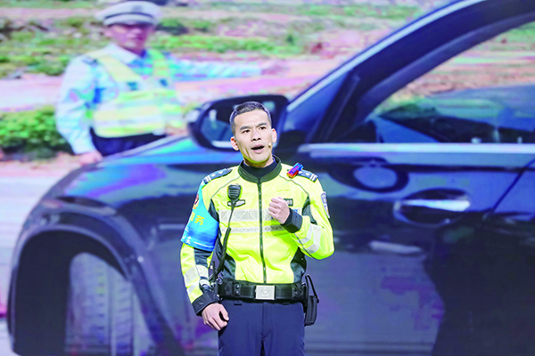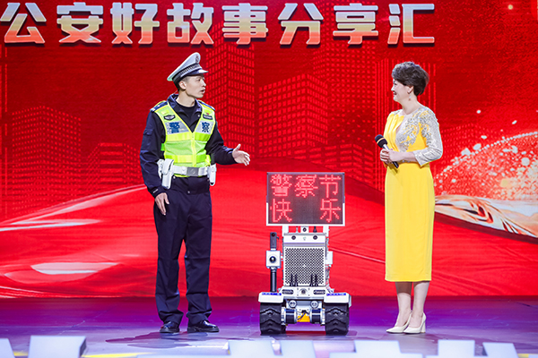 省公安厅交警总队南平高速公路支队民警倪羽带来了他的特殊“战友”——警用无人机“鹰眼”和预警机器人“铁甲哨兵”。憨态可掬的机器人登台,俏皮地说出“雨雪天气,不要炫技”时,逗得现场欢笑声一片。