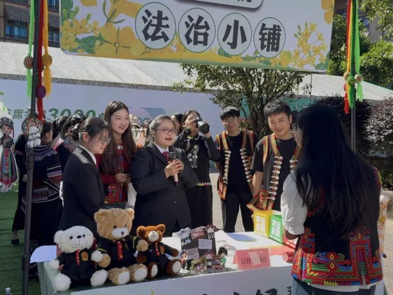 近日,一年一度的哈尼“十月年”长街古宴在云南省红河哈尼族彝族自治州绿春县盛大开席。各族群众欢聚一堂,盛席醴酒,祈福同庆。在这个欢乐的节日里,绿春县人民法院的“法治小铺”热闹开张。“法治小铺”以法治小游戏、“面对面”普法等方式,让“法治”与民族节庆巧妙融合,将法律送到人民群众身边,为千年长街古宴增添“法”味,共谱法治护航民族团结进步的“和谐曲”。