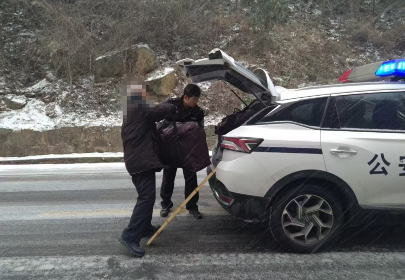 ▲十堰交警护送在G246国道上负重独行老人安全回家