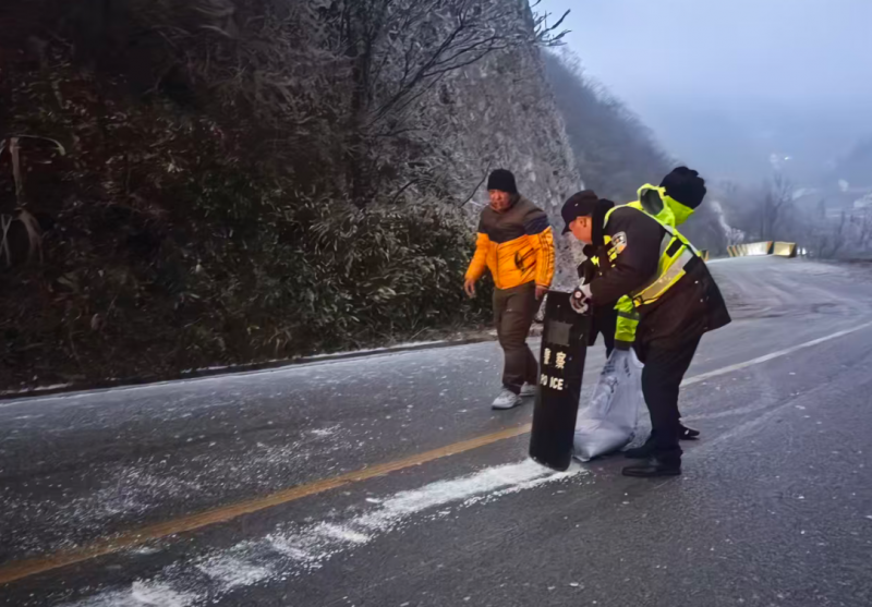 各地交警坚持“早预警、早准备、早处置”原则,在易结冰桥梁、隧道、陡坡等重点路段提前布防,撒布融雪剂,全面排查隐患,筑牢第一道安全防线。