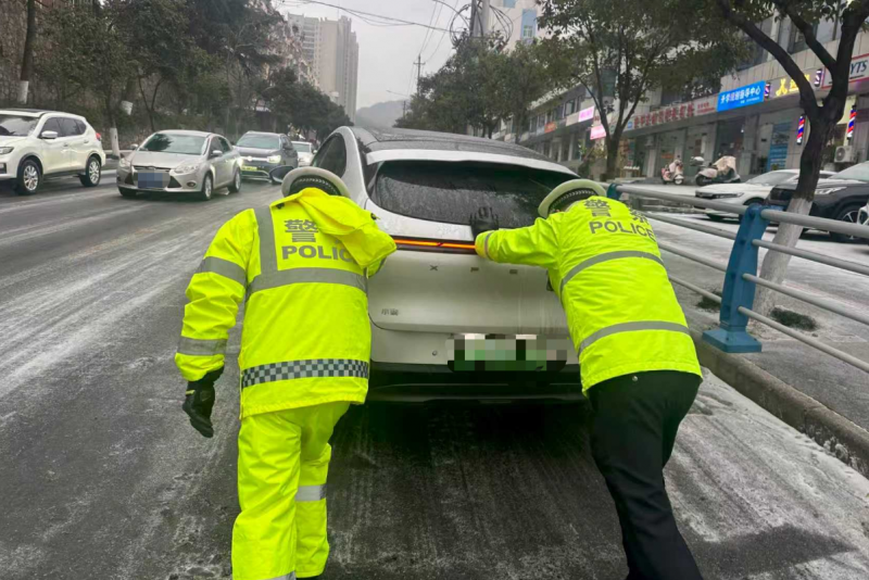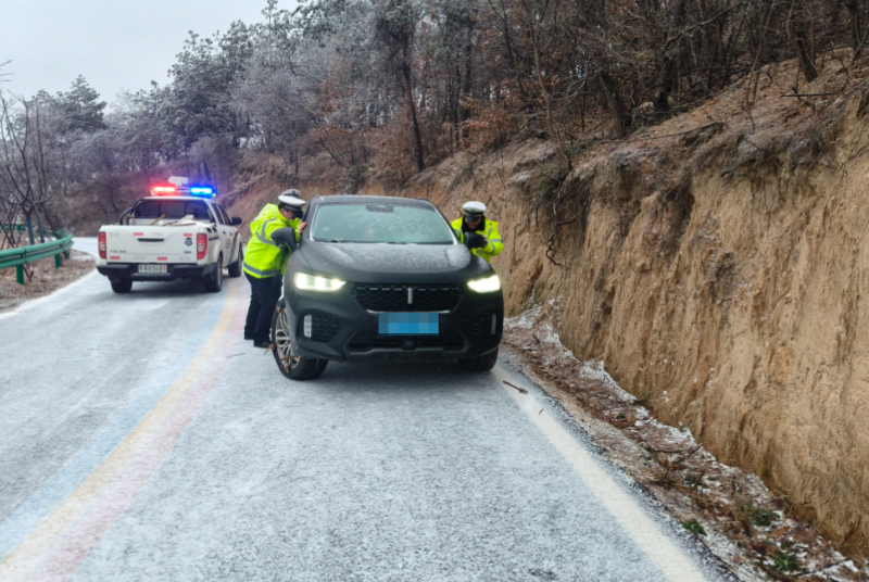 ▲十堰交警在枫土路提醒过往车辆冰雪天气路面湿滑、减速慢行