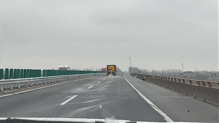 ▲高警三支队联合养护单位在瓷泥湖大桥开展融雪撒布作业