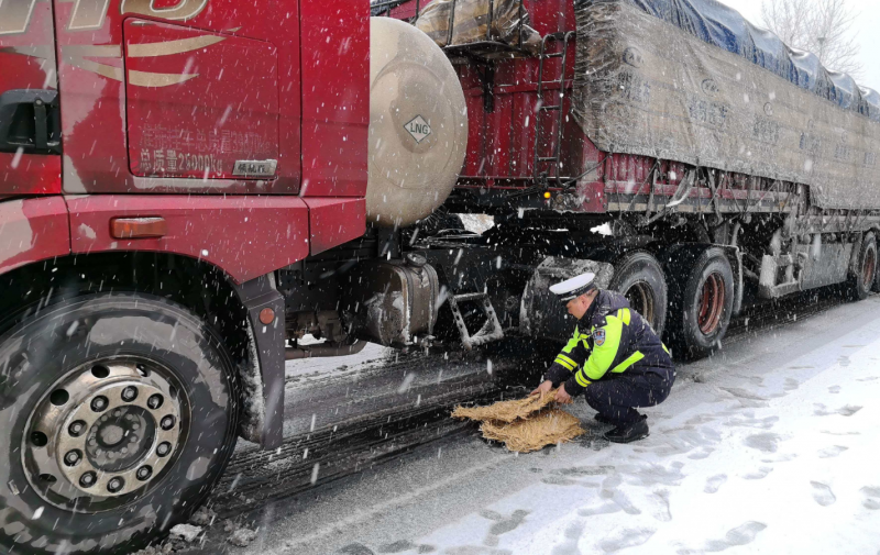 ▲十堰交警在209国道积雪路段帮过往车辆安装防滑链