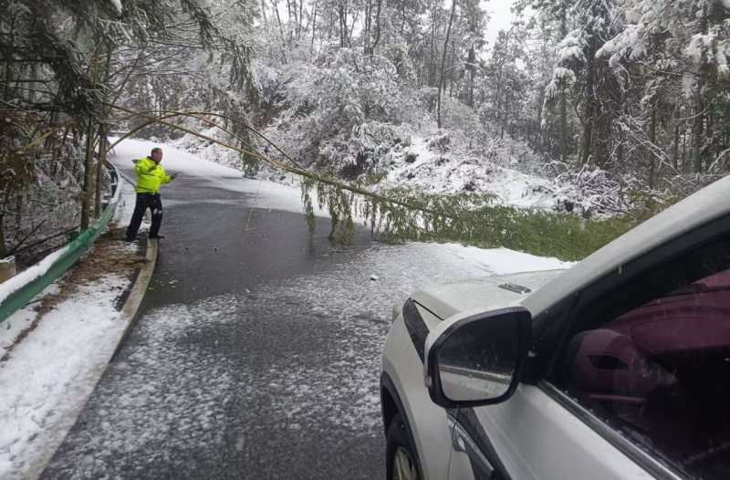▲黄冈交警深入三角山景区,清理路面倒伏树干保障安全畅通
