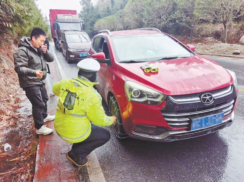 资源交警在结冰路段给被困车辆安装防滑链。