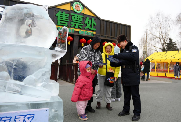 此外,民警在执勤过程中,主动向游客发放宣传单,面对面开展安全宣讲,普及冬季出行安全常识和应急避险知识,提醒游客严格遵守游园规定、看管好随身物品,警惕“低价游”“特殊通道”等诈骗陷阱,切实提升游客自身安全防范意识,让每一位游客都能安心游园、舒心赏景。