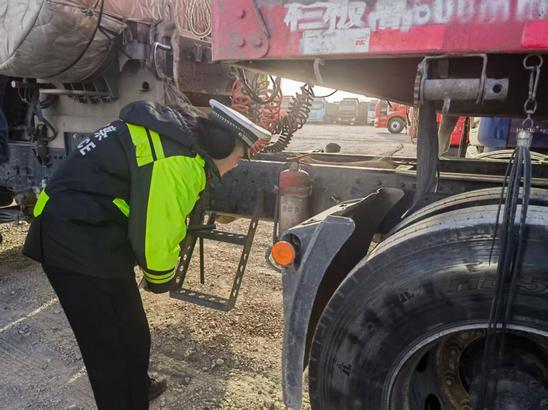 在货运车辆临时停靠点,一名交警俯身弯腰,检查大货车的底盘部件。
