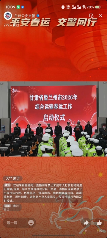 活动现场,广大群众、运输企业代表、驾驶人代表及媒体记者等共300余人现场参与。启动仪式还通过“视听甘肃”“甘肃公安交警”等新媒体平台同步直播,37.6万网友在线观看,线上线下同步传递春运安全出行理念。