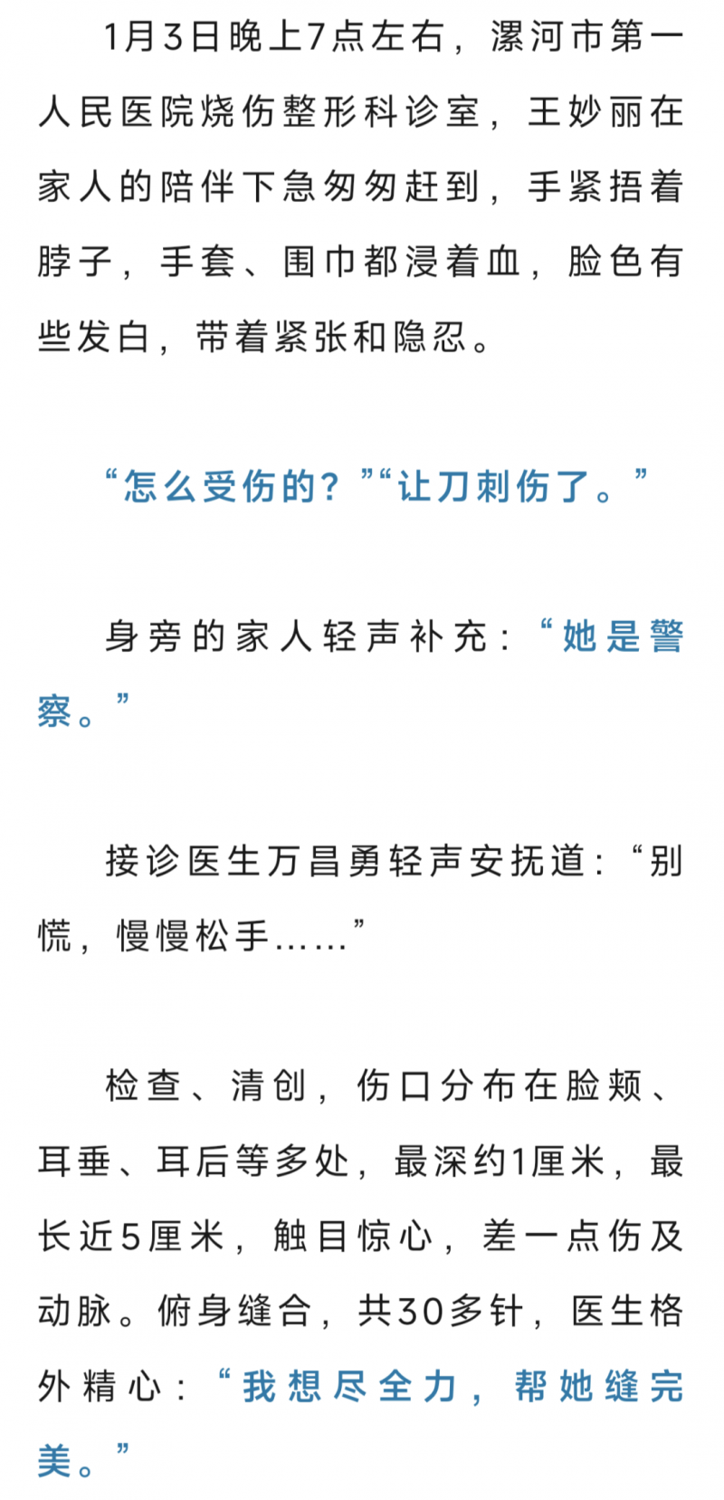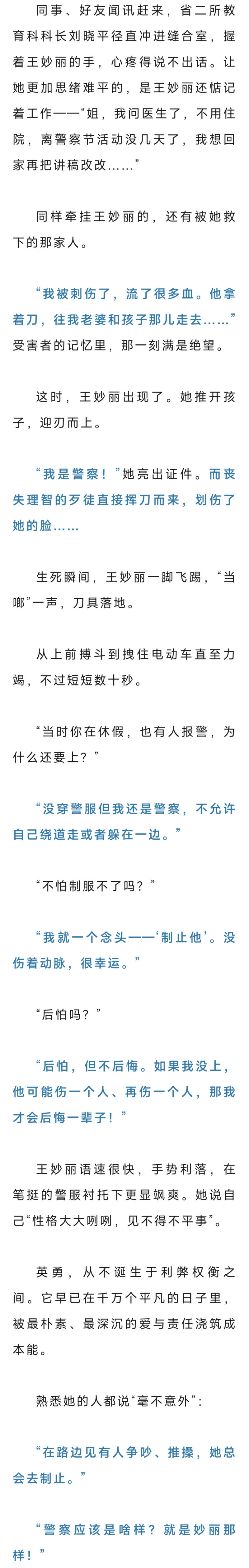 那是1月3日,休假中的王妙丽带着孩子外出。路口,两名男子的争执骤然升级,一人竟掏出了刀。她一把将孩子推到旁边,自己冲了上去,徒手夺刀、被刀划伤、把刀一脚踢飞……歹徒跳上电动车企图逃离,而她一手捂着流血的脖颈,另一只手,死死拽住开足马力的车身。