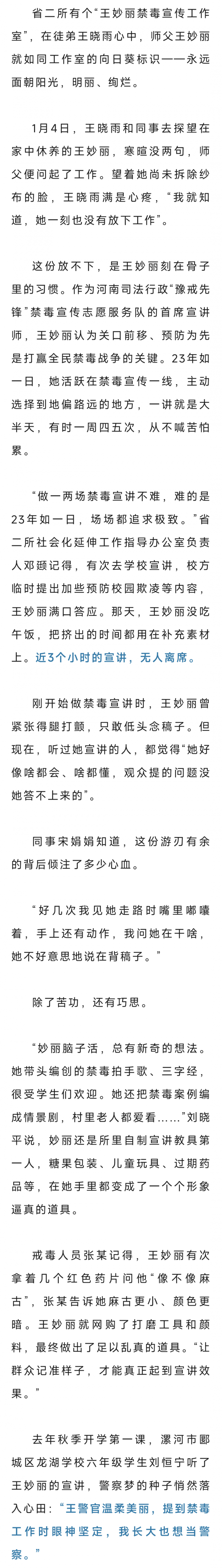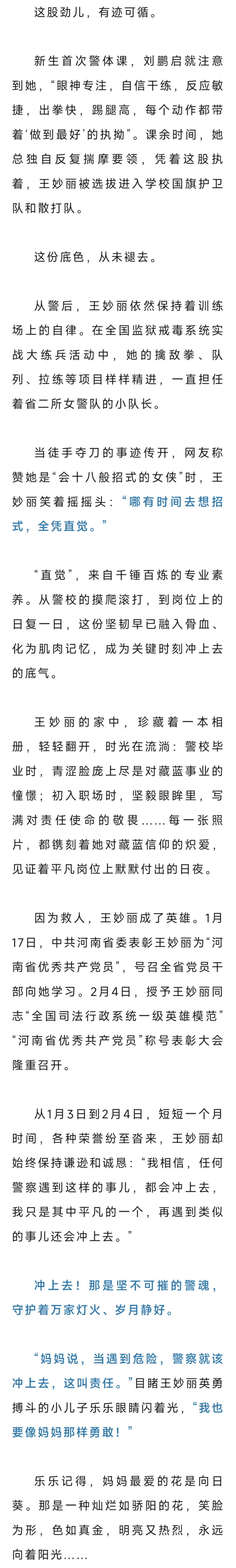 事迹传回母校河南司法警官职业学院,当年的辅导员刘鹏启既担心又骄傲,“假期,便装,还带着孩子,她就算没站出来,谁还能说些什么?可她呢,还是学生时代那个王妙丽”。