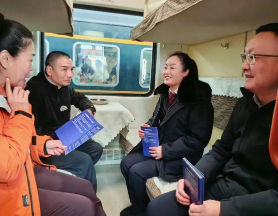 随后,检察官同人民监督员一同登上列车,将车厢变为“移动法治课堂”。检察官向旅客发放宣传手册、讲解法律政策,人民监督员则以“监督者”身份全程见证。“之前听说过检察宣传,但有人民监督员在场,感觉更放心、更可信。”旅客在交流中表示。这种“检察讲解+监督见证”的方式,让普法宣传更具公信力。