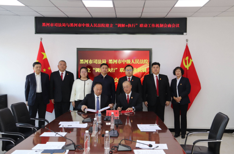 2月9日,黑龙江省黑河市司法局与黑河市中级人民法院举行会商会议,签署《关于建立“执行+调解”联动工作机制合作框架协议》,双方将在优化法治化营商环境方面深化务实合作。黑河市政府副市长、市公安局局长贾牧樵,黑河市中级人民法院院长张哲浩出席会议并讲话。黑河市司法局局长赵明与黑河市中级人民法院副院长王忠东签署合作协议。
