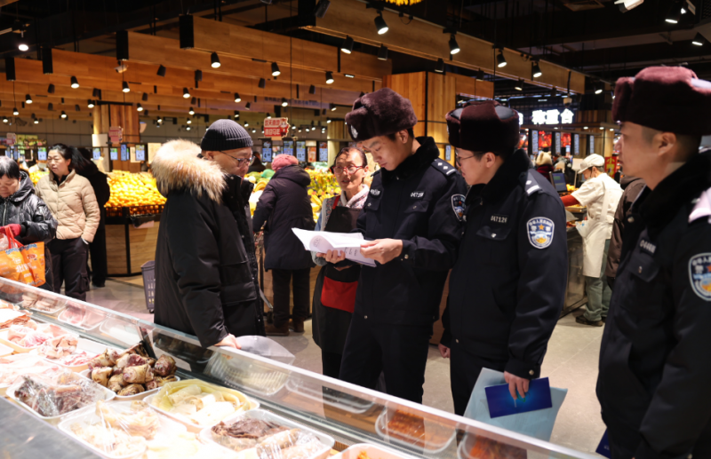 超市货架前,民警的身影同样忙碌。他们重点排查米面油、糕点、熟食制品等热销年货,仔细查看包装上的生产日期、保质期等方面内容。