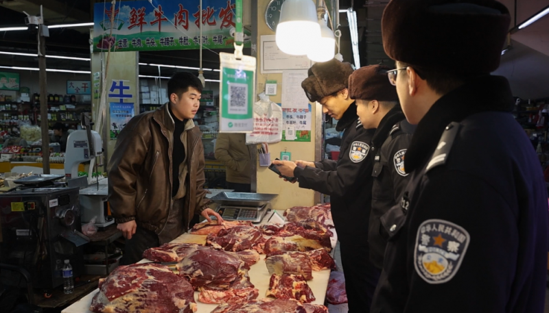 “老板,麻烦出示一下冷链食品的检疫证明和进货台账,溯源码也要,我们核对一下。”清晨的农贸市场寒意未消,黑龙江省牡丹江市东宁市公安局环食药侦大队民警陈涛和同事们已经穿梭在熙攘的摊位间。
