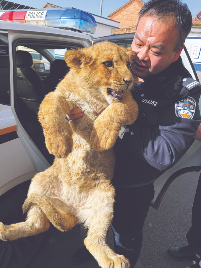 民警将小狮子带回救助。王冠楠摄