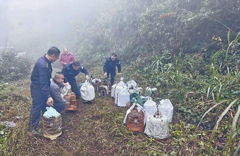 2026年2月23日上午,一场野外放生活动在山间密林中悄然进行。放生现场,凌云县公安局民警与野生动物保护站工作人员小心翼翼打开鸟笼,伴随着清脆的鸟鸣,27只野生画眉鸟展翅飞向密林,回到了属于它们的自然家园。