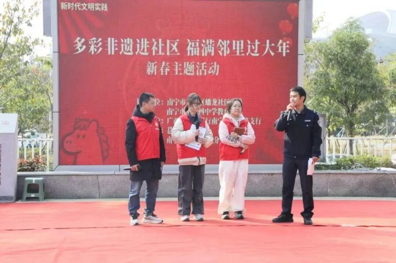 日前,南宁市良庆区良庆镇蟠龙社区宪法主题广场,“多彩非遗进社区福满邻里过大年”新春主题活动如火如荼,浓郁年味里的平安气息扑面而来。