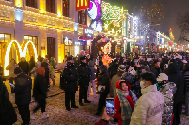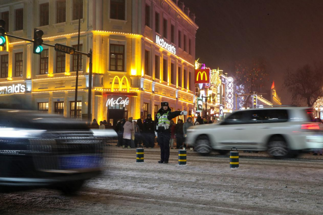 相隔数里的百年老街同样流光溢彩。道里分局执勤民警踏着面包石,在中央大街非遗灯展长廊下巡逻值守,实时疏导人流、排查隐患。警灯闪烁处,花灯正璀璨,那抹穿梭于人群中的藏蓝身影,与游客的笑脸共同绘就了老街平安画卷。