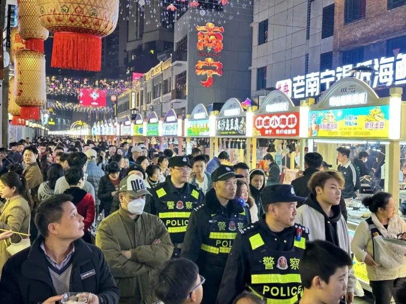 南宁市公安局青秀分局特巡警大队副大队长廖斌良告诉记者,2026年2月以来,该局强化特巡警武装巡逻、派出所治安巡逻、群防群治力量巡防等三梯次巡逻防控力量,探索运用“线上+线下”巡查模式,增强商贸街区的巡逻防控密度,全力营造平安的节前氛围。