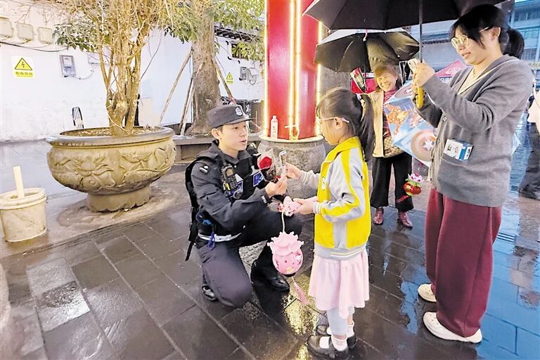 3月3日晚,元宵佳节,春雨绵绵。海南海口府城元宵换花节现场之一的海口府城福地美食街门前,游人如织、暖意融融。海口市公安局琼山分局反诈中心民警王安旺正用一份小礼物,温暖着一名前来换花的小孩。
