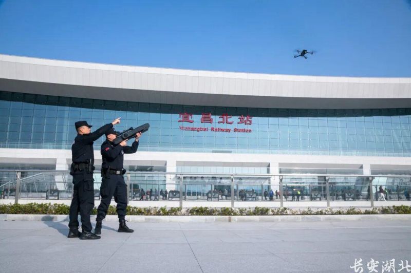 ▲夷陵区公安分局民警在宜昌北站区域开展处置“黑飞”无人机训练