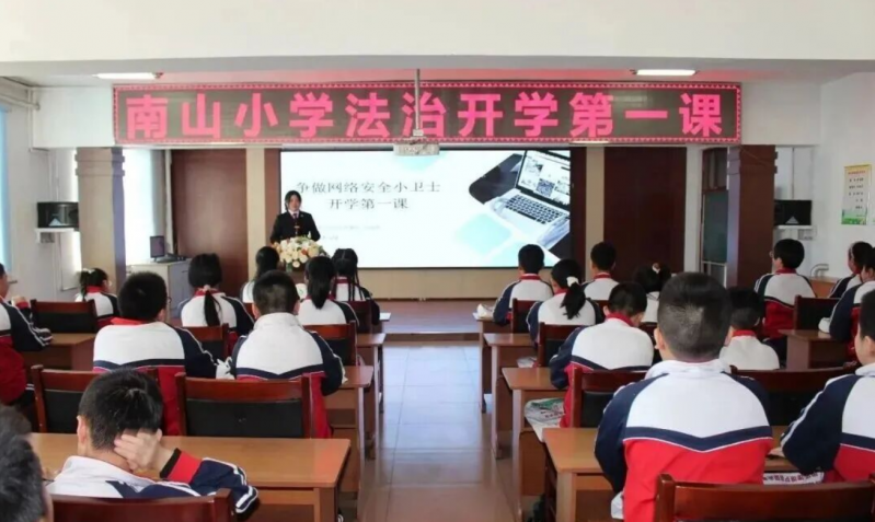 南山区人民检察院“未你鹤彩•启明”工作室检察人员走进逸夫小学和南山小学,以“争做网络安全小卫士”为主题,通过“沉浸式体验+互动式宣誓”形式,开展别开生面的开学法治课。课堂上,未检人员创新设置“学生主演+情景再现”环节,还原网络诈骗情景剧,以案释法剖析诈骗套路、传授个人信息保护方法。活动尾声设置“法治微心愿”环节,同学们写下感悟汇聚成“法治心愿墙”,让网络安全理念入脑入心。
