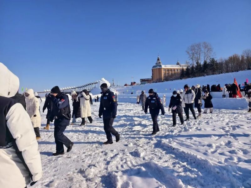 严把项目安全保障关,将冰雪项目建设质量作为平安护游前置基础,规划阶段,结合江边冬季低温、风雪大等特性及游客需求,科学优化滑梯、迷宫等设施设计布局;施工环节,严选抗冻抗压防滑材料,严控施工工艺;验收阶段,组建专业验收小组实地逐项检测,发现问题立行立改,源头筑牢设施安全防线。严把医疗救治保障关,构建“景区急救+医疗联动+应急保障”全方位医疗服务体系。在重点冰雪活动现场设立医疗急救车,配备专业医护人员、防寒急救药品等设备,与巡逻队、志愿服务队建立联动响应机制。严把应急处突保障关,完善极端天气交通应急预案,建立气象、交通、应急等多部门联动机制,实时推送极端天气预警信息,强化人流、车流实时监测与引导。在冰雪乐园、冰钓等危险区域设置应急救援点,在网红打卡地等人员密集部位布设应急处置点,配备应急物资,实现游客走失、物品遗失等事项5分钟内快速处置,提高处置办结效率。