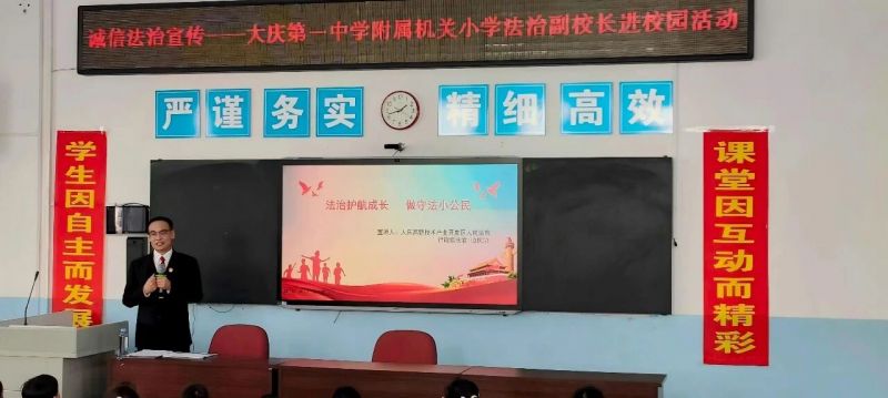 大庆高新技术产业开发区人民法院行政综合庭的法官以法治副校长身份走进大庆第一中学附属机关小学开展普法宣传活动,为孩子们带来一堂堂生动有趣的法治启蒙课。