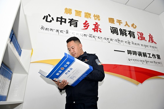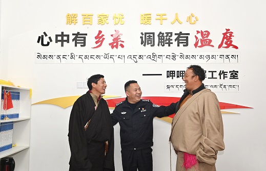 2024年11月,甘孜公安首个以个人命名的调解室——“呷呷调解工作室”正式揭牌。呷绒降泽作为首席调解员,秉承“调的是纠纷,解的是人心”理念,创新推出“情、理、法”融合调解模式,让调解工作更有温度、更具力度,让无数剑拔弩张的矛盾化为握手言和的温情。