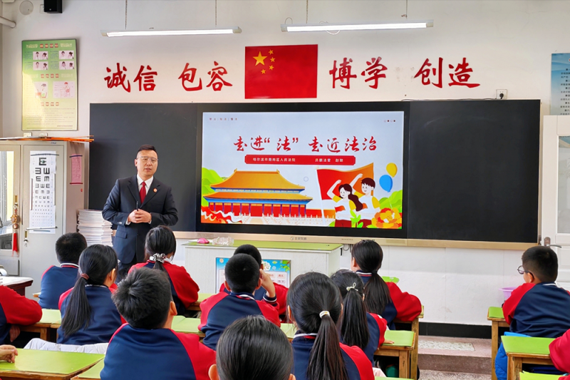“法律不仅关乎是非对错,更关乎我们如何成为更好的自己。”哈尔滨市奋斗小学校的课堂上,综合审判庭赵聪法官以“奋斗与成长”为切入点,为同学们带来了一堂走进“法”走近法治的“开学第一课”。他用生动的语言、贴近生活的案例,告诉同学们在网络世界里如何辨别信息、保护隐私、避免沉迷。课堂上,同学们积极回答问题,气氛热烈,法治的种子在思考与交流中生根发芽。