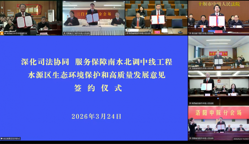 3月24日,陕西、河南、湖北三省七市中级人民法院以视频连线方式,共同签署《关于深化司法协同服务保障南水北调中线工程水源区生态环境保护和高质量发展的意见》(以下简称《意见》)。